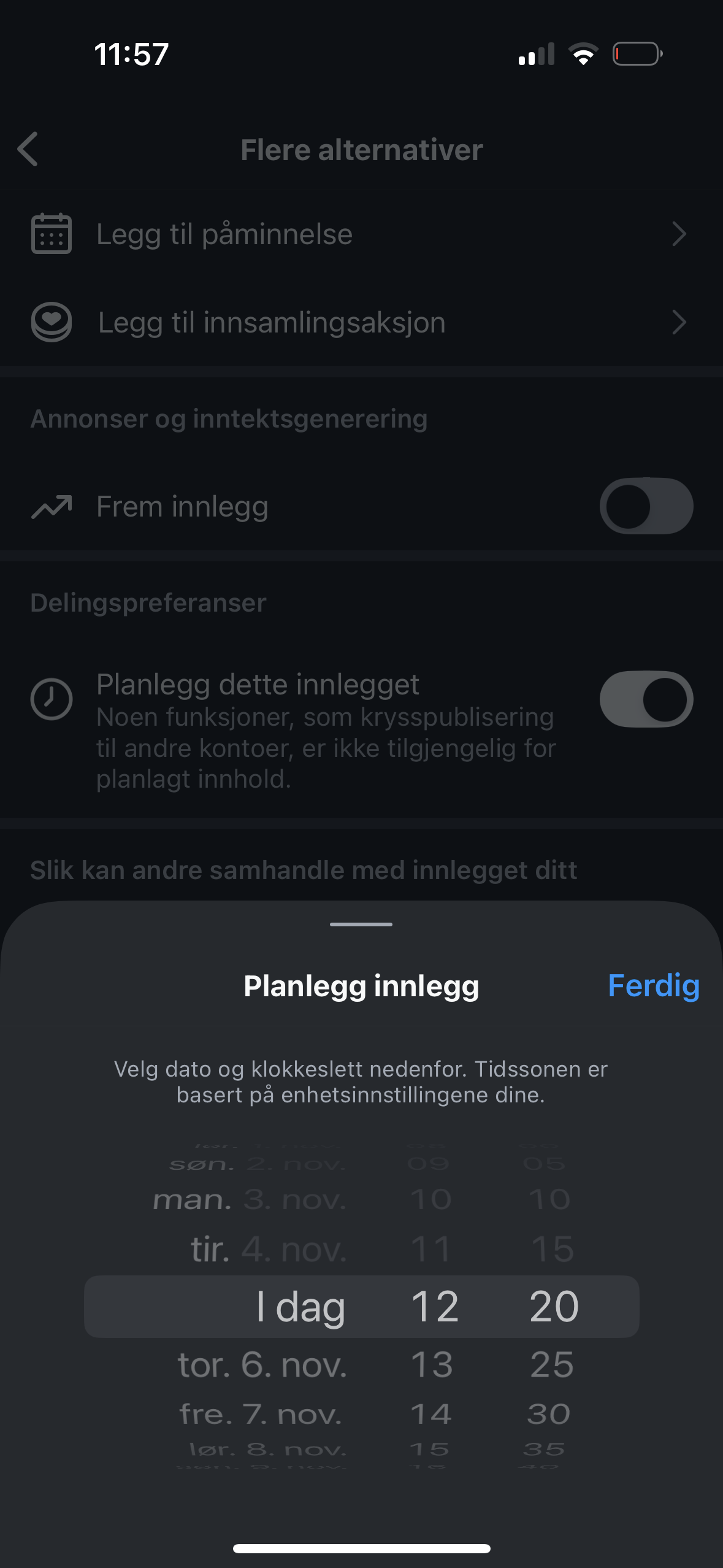 I 2025 fungerer planlegging direkte i appen mye bedre enn tidligere. Du kan nå forhåndspublisere både reels og innlegg, og velge nøyaktig tidspunkt: